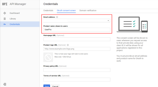 4. From your OAuth Consent screen menu, ensure an email address is selected and product name is entered (your website name is fine). You may also wish to complete the optional sections further and add your website logo. Click Save.